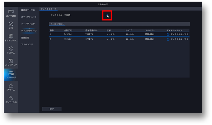 設定>ハードディスク>ディスクグループ と進み、「ON」をクリックします。