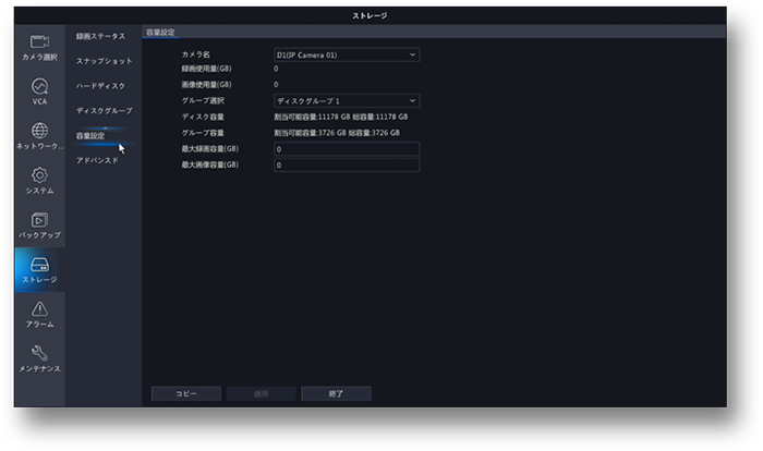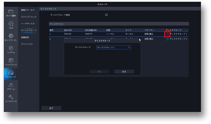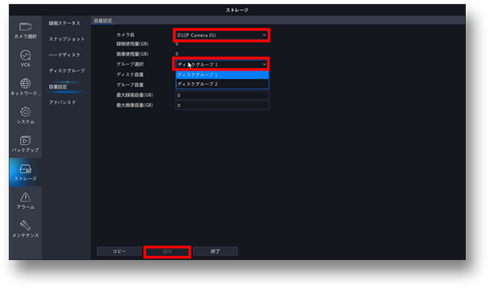 設定するカメラ名及びディスクグループを選択し、「適用」をクリックします。