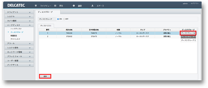 変更したいハードディスクのディスクグループを変更し、「保存」をクリックします。