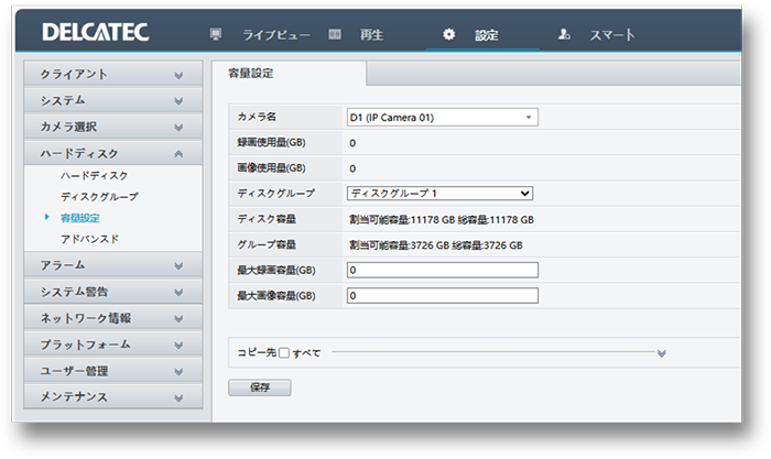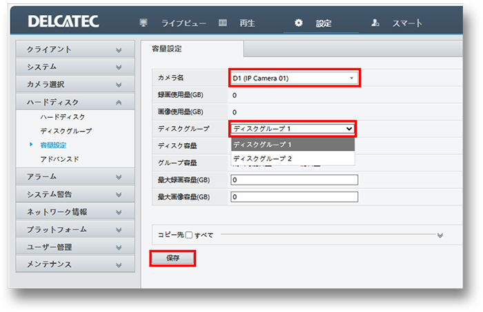設定するカメラ名及びディスクグループを選択し、「保存」をクリックします。