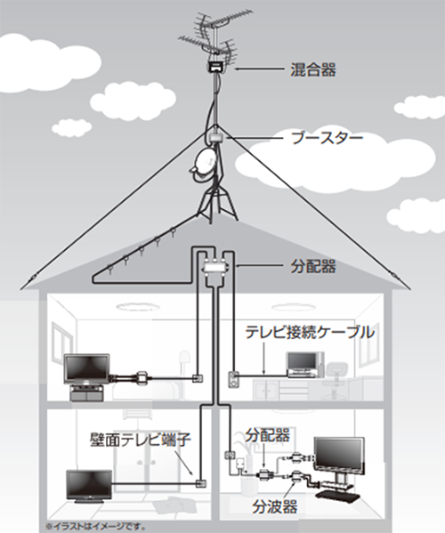 上記1~4を順番に確認いただいても改善がない場合は恐れ入りますがお近くの電気店・アンテナ設置業者・ハウスメーカーへご相談をお願い致します。
