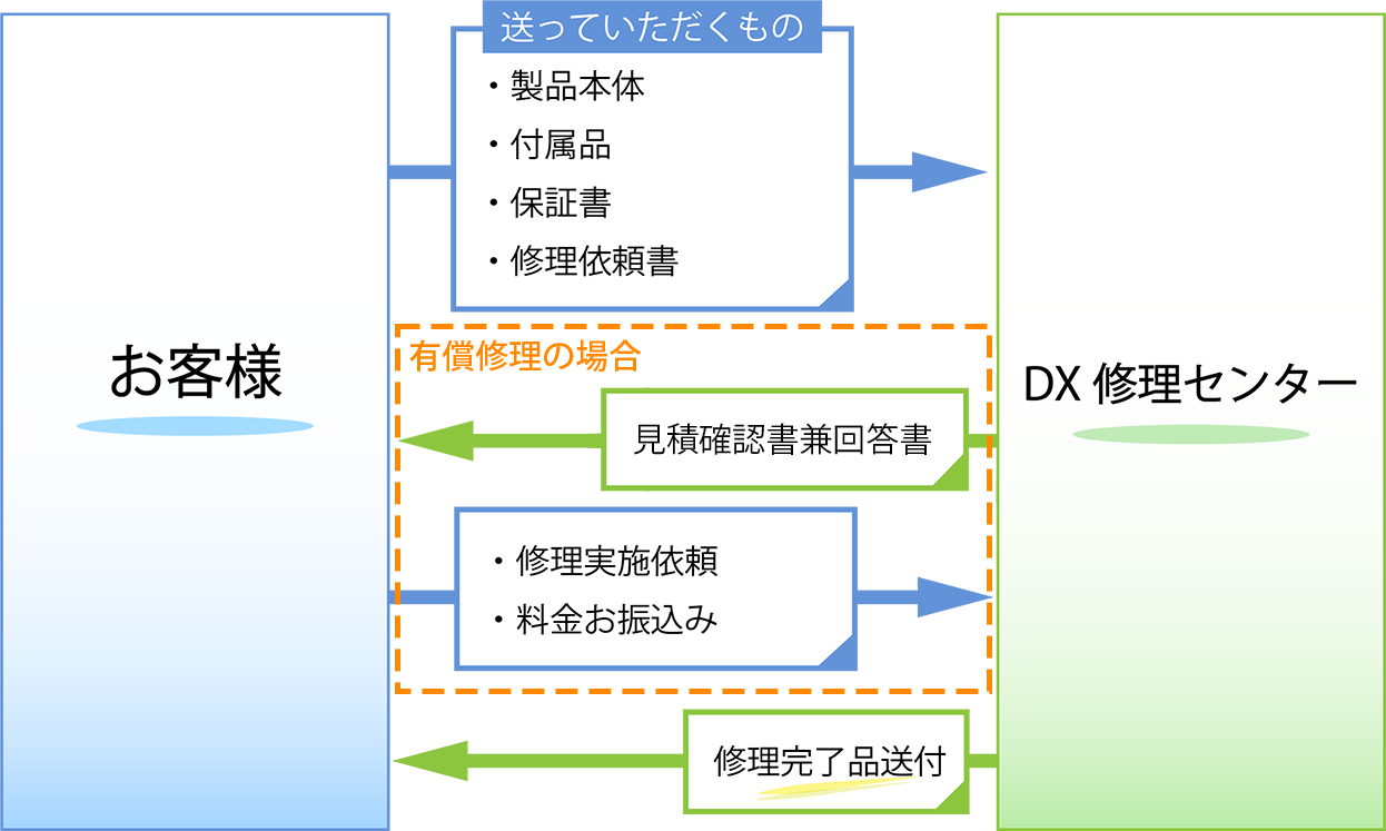 下図をご参照下さい。 修理のご依頼から修理品お届けまでの流れ