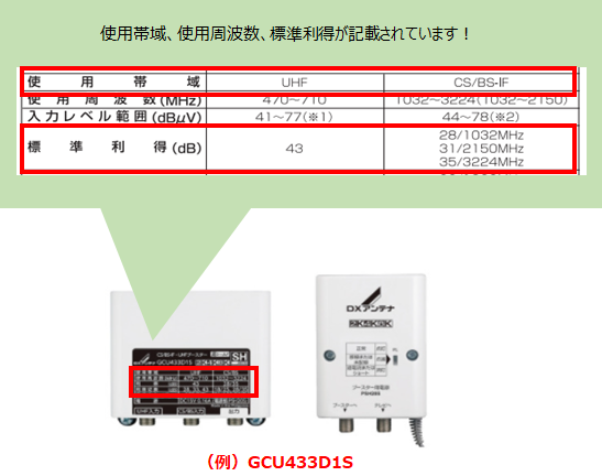 現在ご利用のブースターが「どの放送の電波を増幅するものか」を確認します。 ラベルの「使用帯域」または「周波数」の欄をご覧ください。