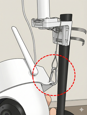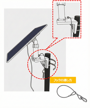 カメラ側の落下防止穴へケーブルのフックを取り付けます。